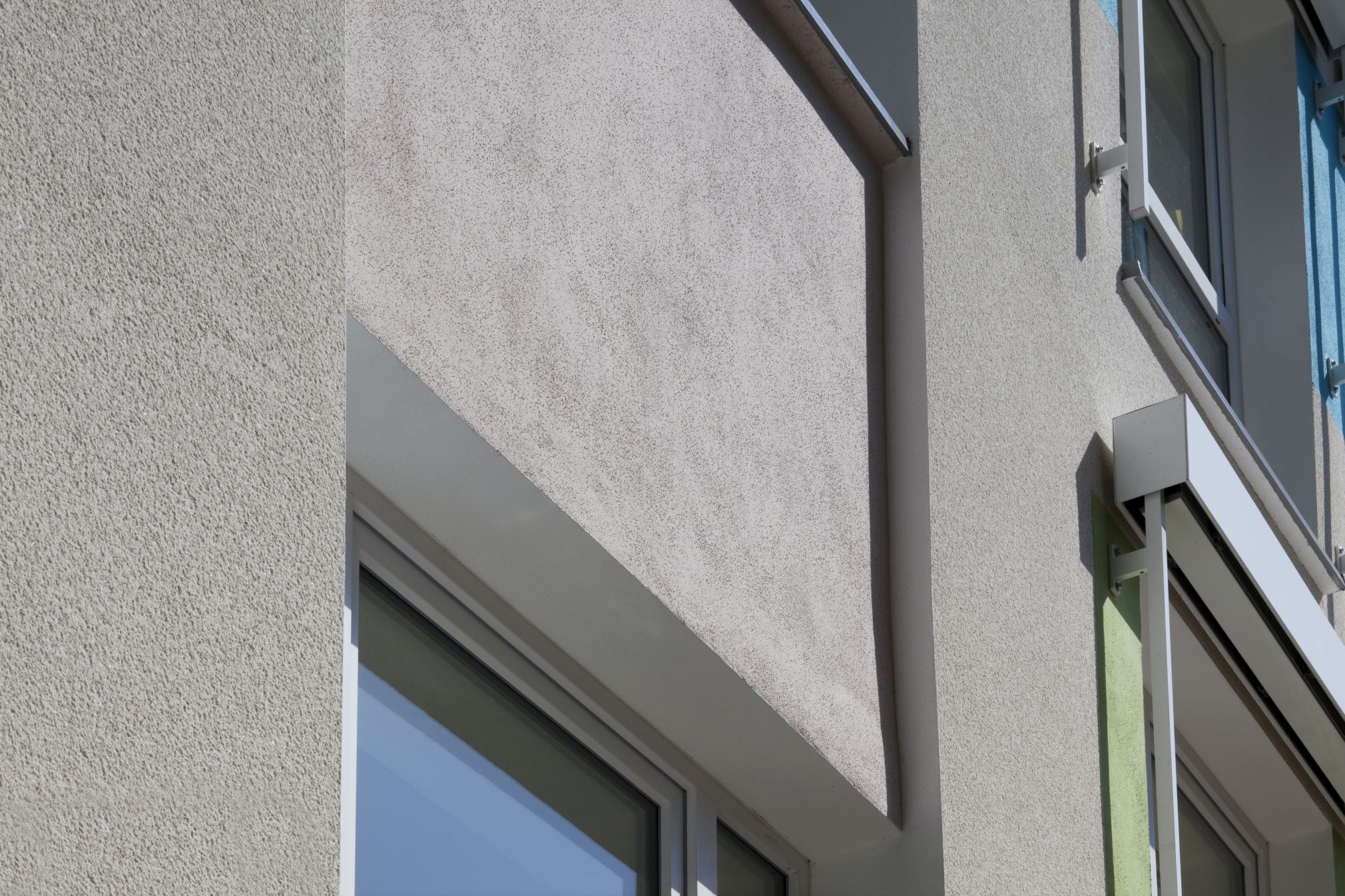 Die alte Bausubstanz erhielt ein neues Wärmedämmverbundsystem. Dabei haben wir die Architektur kaum verändert, sondern durch farbige Putzfelder und mineralische Edelputze aufgewertet